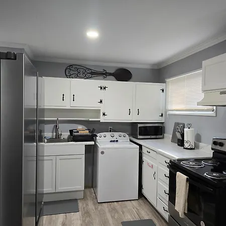 In der 1-Zimmer-Villa Cozy Haven In Hampton Roads Near Beaches, Military Bases & Historic Sites stehen Gästen eine Küche sowie ein Essbereich im Freien zur Verfügung. Die Küche bietet auch eine Mikrowelle, einen Kühlschrank und Küchenutensilien.